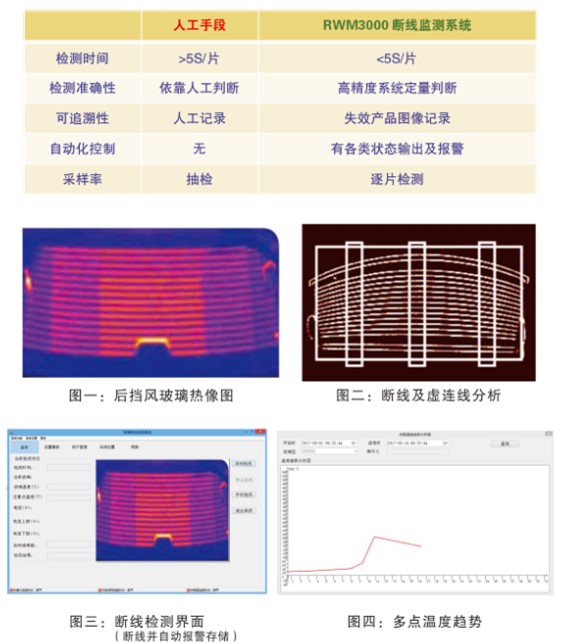 RWM3000后檔玻璃電阻絲斷線監(jiān)測系統(tǒng)是用通過紅外熱像儀熱分布分析原理,檢測后檔玻璃電阻絲是否斷線的系統(tǒng)。該系統(tǒng)可以自動判斷生產(chǎn)過程中,后檔玻璃電阻絲是否有斷線缺陷。