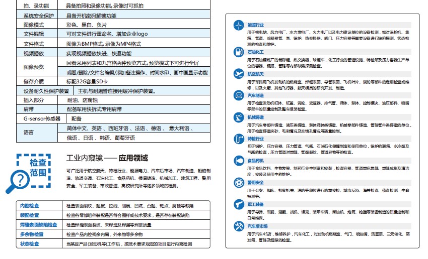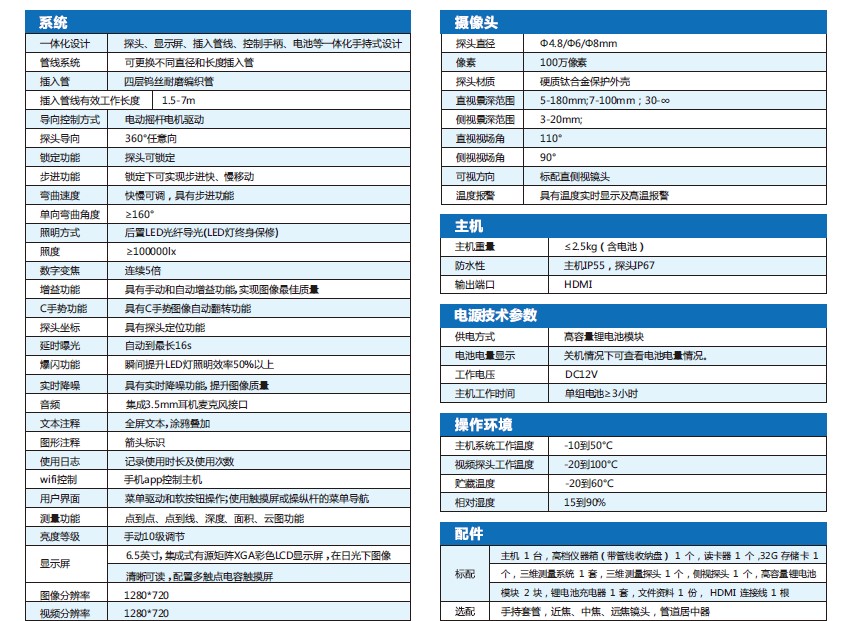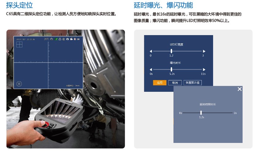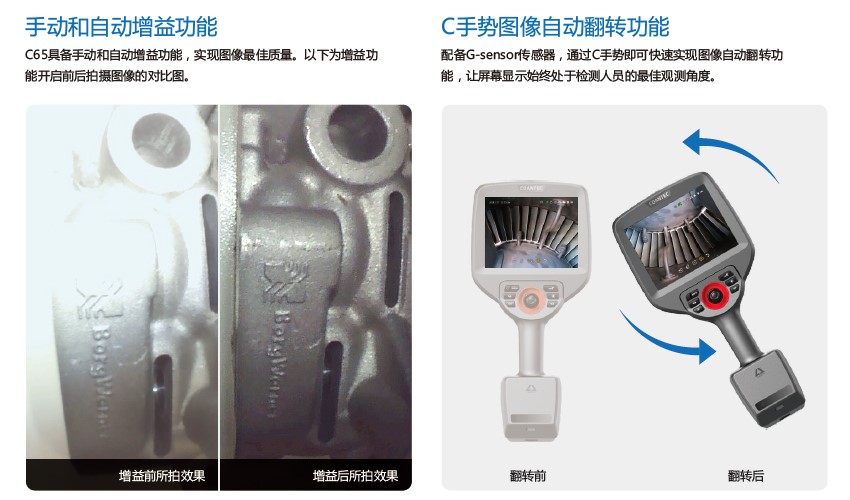 C65全新定義全功能一體化工業(yè)內(nèi)窺鏡:100萬(wàn)像素高清攝像頭,點(diǎn)到點(diǎn)、點(diǎn)到線、深度、面積、云圖測(cè)量功能,可更換不同直徑、長(zhǎng)度插入管,手動(dòng)和自動(dòng)增益功能,C手勢(shì)圖像自動(dòng)翻轉(zhuǎn)功能,探頭定位、延時(shí)曝光、爆閃功能,手機(jī)APP控制主機(jī)。